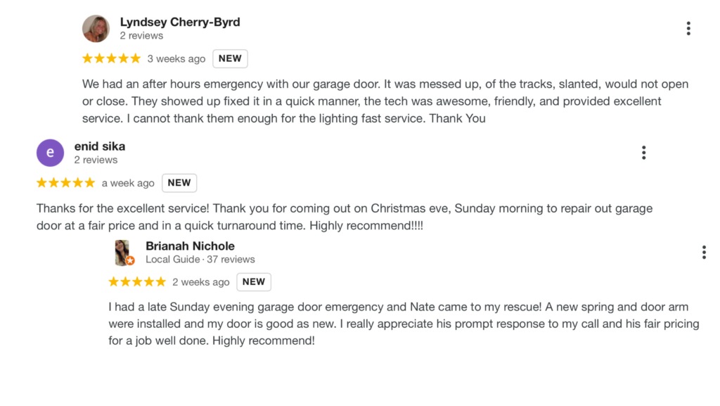 “Dean was courteous, friendly and did a great job diagnosing my garage door issue. He gave me a quote with options before starting the work, so there were no surprises. He replaced my door springs right then and got my door working before dinner!”